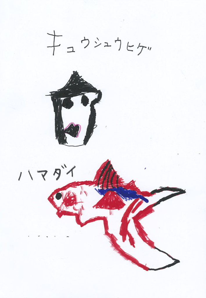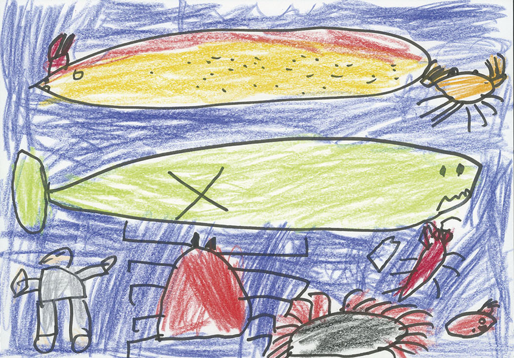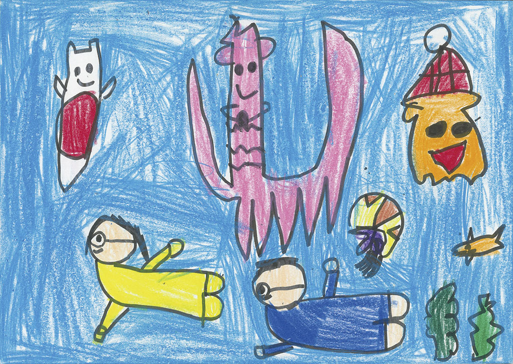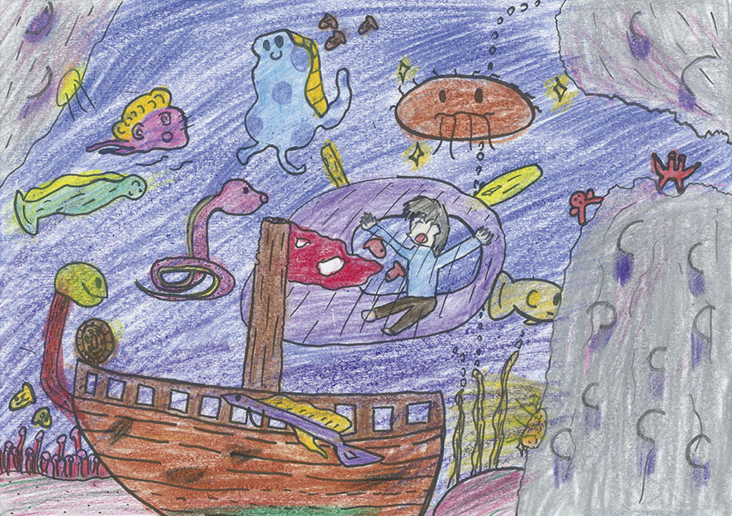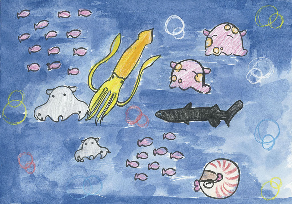 のびのびと描きながらも特徴をとらえていてグッド!深海でラジオを聴いている発想も面白いです。